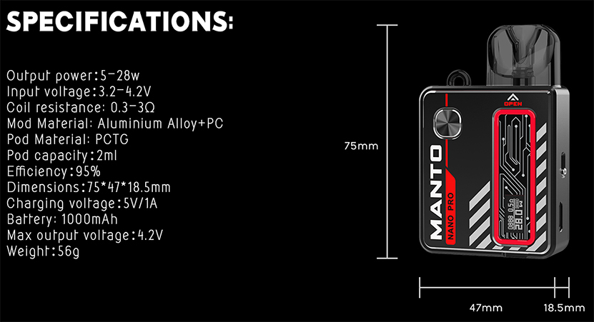 Manto Nano Pro Kit features an insignificant yet potent physique. It has an adjustable airflow switch and a 1000mAh battery capacity, as well as type-c charging.